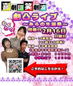 クリスマスファン感謝祭 クリスマスファン感謝祭 を2025年12月21日(日)の午後2時から平戸橋笑劇場で開催します。 入場料 (税込み) 大 人 3000円 中学生以下 1500円 スリッパをご用意下さい 中学生・ […]