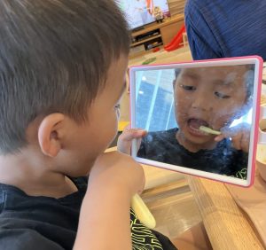 大好きな唐揚げを食べて、「歯に挟まった🥲」と必死で鏡を見ながら歯ブラシで取ろうとする4歳児😅