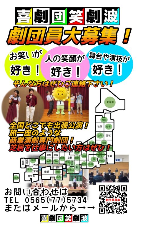笑劇波は一緒に公演に出演できる役者!スタッフを大募集中! 応募される際は笑劇波メールフォームから 役者・スタッフの応募は以下全てをご入力いただき、送信ボタンを押して下さい。 氏名(本名) フリガナ 生年月日(西暦) 住所(市町村名から) メールアドレス 携帯電話番号 笑劇波事務所までの交通手段 志望理由(役者かスタッフか記入。経験者は実績も記入下さい) このフォームはスパムを低減するために Akismet を使っています。 データの処理方法の詳細はこちらをご覧ください。 皆様のご応募おまちしております。 投稿者プロフィール 美麻あかね社長・座長 老婆、男役、司会、テレビレポーターと何でもこなす頼れる社長 最新の投稿 投稿者アーカイブ 笑劇の波乱万丈2025年12月13日旭交流館へ 笑劇の波乱万丈2025年12月12日いちごサンド クレンズ 笑劇の波乱万丈2025年12月12日SUBWAYが! 笑劇の波乱万丈2025年12月11日JALマーク フォローしてね @showgekiha Tweet Pocket Share on Tumblr 今月の公演情報 一般入場可能な出張公演を毎月動画でお知らせします。 YouTube 笑劇波チャンネル