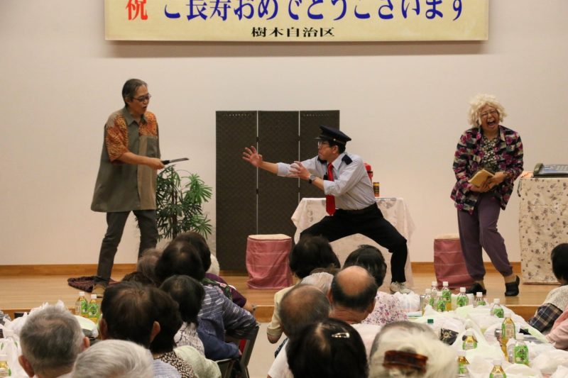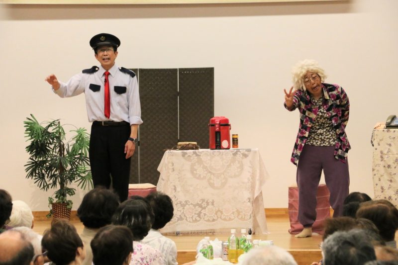 衣装や道具を工夫しながら今日も詐欺被害防止の為に分かりやすく手口を笑劇を通してお届けしました。