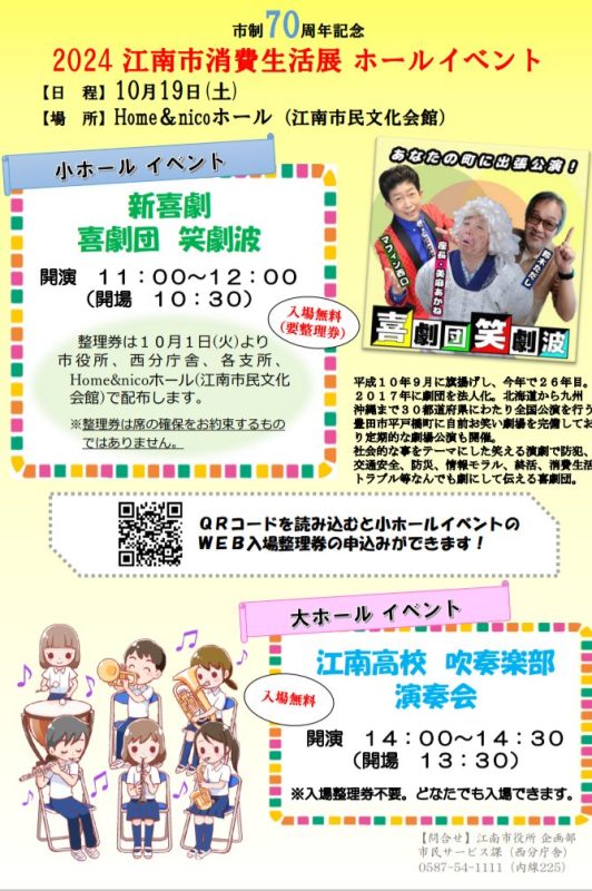 江南市・市制70周年記念 消費生活展に笑劇波が出演します!入場無料ですが整理券が必要となります! 10月1日から整理券申し込み開始となります。10月19日(土)開催の消費生活展!ぜひおでかけください! 投稿者プロフィール 美麻あかね社長・座長 老婆、男役、司会、テレビレポーターと何でもこなす頼れる社長 最新の投稿 投稿者アーカイブ 笑劇の波乱万丈2025年12月13日旭交流館へ 笑劇の波乱万丈2025年12月12日いちごサンド クレンズ 笑劇の波乱万丈2025年12月12日SUBWAYが! 笑劇の波乱万丈2025年12月11日JALマーク フォローしてね @showgekiha Tweet Pocket Share on Tumblr 今月の公演情報 一般入場可能な出張公演を毎月動画でお知らせします。 YouTube 笑劇波チャンネル