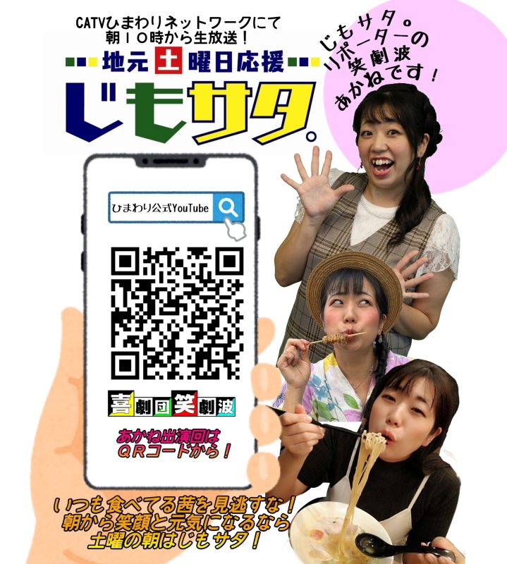 今日もじもサタ。見てくれましたか? ひまわりエリア外の皆様も特集は公式YouTubeチャンネルにてご覧いただけますのでぜひ御覧ください! もっとみんなにじもサタ。を見てほしいっ! 近所や知らなかった素敵なお店が見つかりますよ💕💕 投稿者プロフィール 美麻あかね社長・座長 老婆、男役、司会、テレビレポーターと何でもこなす頼れる社長 最新の投稿 投稿者アーカイブ 笑劇の波乱万丈2025年12月13日旭交流館へ 笑劇の波乱万丈2025年12月12日いちごサンド クレンズ 笑劇の波乱万丈2025年12月12日SUBWAYが! 笑劇の波乱万丈2025年12月11日JALマーク フォローしてね @showgekiha Tweet Pocket Share on Tumblr 今月の公演情報 一般入場可能な出張公演を毎月動画でお知らせします。 YouTube 笑劇波チャンネル