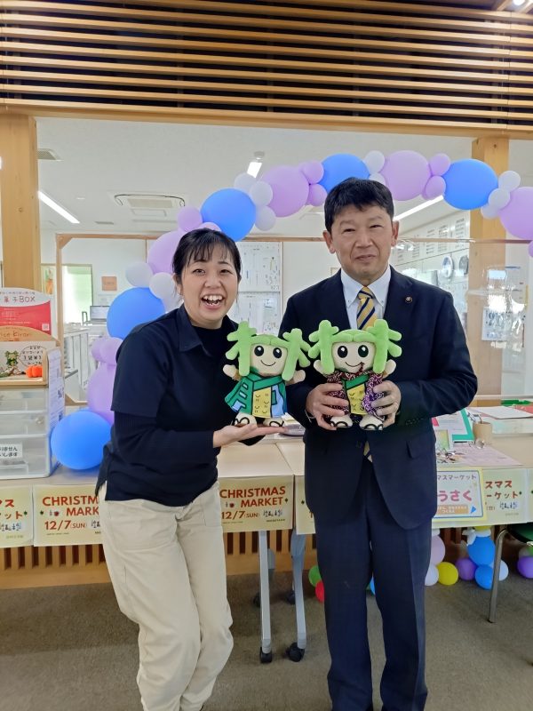 地元の石川先生と前林のキャラクター「まえちゃん」を持って📸