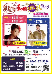 今日は巫女乙姉さんも来て稽古〜 週末がんばりまぁす 投稿者プロフィール 美麻あかね社長・座長 老婆、男役、司会、テレビレポーターと何でもこなす頼れる社長 最新の投稿 投稿者アーカイブ 笑劇の波乱万丈2025年12月13日旭交流館へ 笑劇の波乱万丈2025年12月12日いちごサンド クレンズ 笑劇の波乱万丈2025年12月12日SUBWAYが! 笑劇の波乱万丈2025年12月11日JALマーク フォローしてね @showgekiha Tweet Pocket Share on Tumblr 今月の公演情報 一般入場可能な出張公演を毎月動画でお知らせします。 YouTube 笑劇波チャンネル
