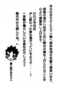 ここはどこ? 放浪の旅に出たみたいな場所 いっぱい歩いて楽しかった〜 このイベントは11月に行われます! お楽しみに〜 投稿者プロフィール 美麻あかね社長・座長 老婆、男役、司会、テレビレポーターと何でもこなす頼れる社長 最新の投稿 投稿者アーカイブ 笑劇の波乱万丈2025年12月13日旭交流館へ 笑劇の波乱万丈2025年12月12日いちごサンド クレンズ 笑劇の波乱万丈2025年12月12日SUBWAYが! 笑劇の波乱万丈2025年12月11日JALマーク フォローしてね @showgekiha Tweet Pocket Share on Tumblr 今月の公演情報 一般入場可能な出張公演を毎月動画でお知らせします。 YouTube 笑劇波チャンネル