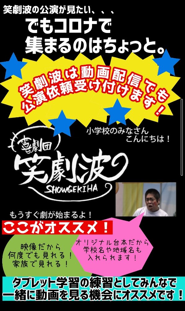 学校などで集まるのが難しければ動画で劇をお届けすることもできます! ぜひご検討ください! お問い合わせは 0565(77)5734まで 投稿者プロフィール 美麻あかね社長・座長 老婆、男役、司会、テレビレポーターと何でもこなす頼れる社長 最新の投稿 投稿者アーカイブ 笑劇の波乱万丈2025年12月13日旭交流館へ 笑劇の波乱万丈2025年12月12日いちごサンド クレンズ 笑劇の波乱万丈2025年12月12日SUBWAYが! 笑劇の波乱万丈2025年12月11日JALマーク フォローしてね @showgekiha Tweet Pocket Share on Tumblr 今月の公演情報 一般入場可能な出張公演を毎月動画でお知らせします。 YouTube 笑劇波チャンネル