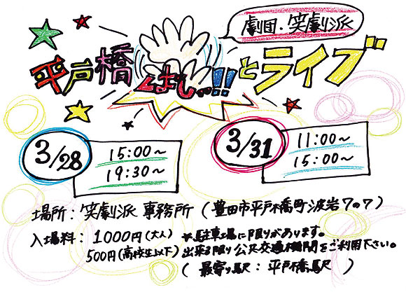 2018年3月28日(水)、3月31日(土)に笑劇派事務所にてライブを行います。初めての試みです。