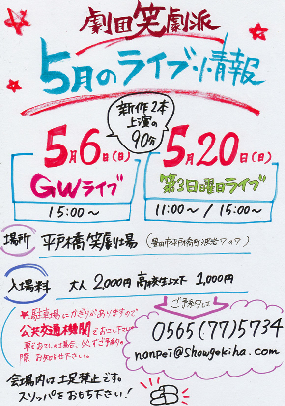 笑劇新作2本の90分の上演です。20周年記念公演のチケットも会場で販売します。ぜひあそびにきてください。