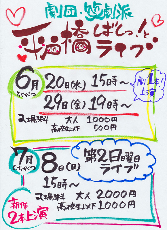 6月20日(水)15:00と29日(金)19:00は笑劇1本、7月8日(日)15:00は笑劇2本上演です。各回、すべて内容を変えてお待ちしております。複数回の観覧ご希望の方は大変申し訳ありませんが回数分だけご送信下さい。