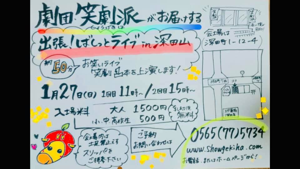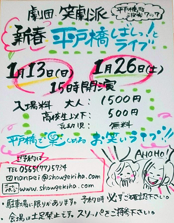 1月13日(日)午後3時 と 1月26日(土) 午後3時より、平戸橋笑劇場で開催します。バシッとライブin深田山の27日(日)の午前11時と午後3時です。
