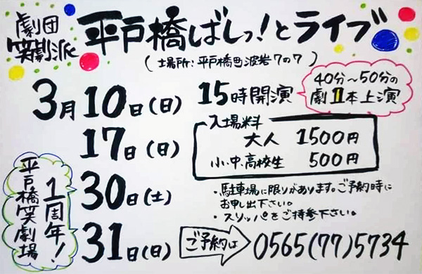 3月10日(日)、3月17日(日)、3月30日(土)、3月31日(日) の午後3時 に平戸橋笑劇場で開催します。