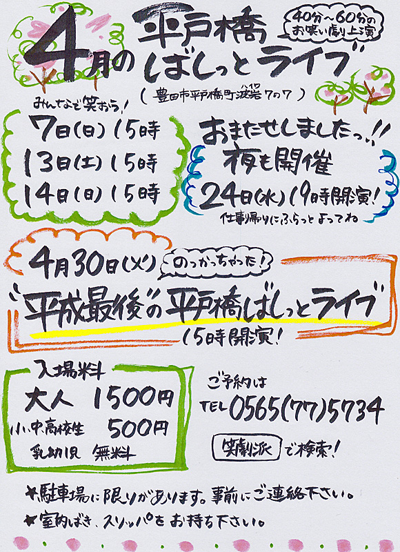 4月7日(日)、4月13日(土)、4月14日(日)、4月30日(祝) の午後3時、4月24日(水)午後7時、5月1日(祝) 、5月25日(土)の午後3時 に平戸橋笑劇場で開催します。