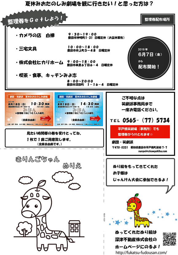 下記の4店舗でチケットを配布しています。インターネットでの予約や取り置き等はできませんのでご了承ください。座席数(各回240席)が限られている為、8月18日(日)のご予定が決まり次第チケットを確保下さい。また、笑劇派事務所(不定休)でも配布しております。