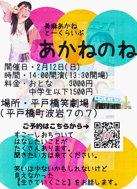 美麻あかねトークライブを2月12日(日)の午後2時に平戸橋笑劇場で開催します。