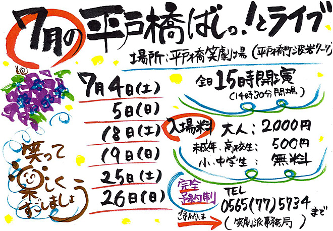 平戸橋ばしっとライブを7月4日(土)、5日(日)、18日(土)、19日(日)、25日(土)、26日(日) の午後3時 (開場 午後2時30分) に平戸橋笑劇場で開催します。1回の定員は通常の半分以下の15名とします。ご予約はお早めに。12日(日)のイベントはこちら
