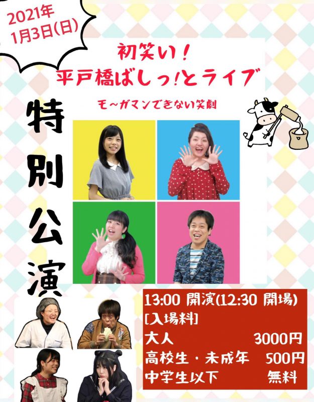 平戸橋ばしっとライブを12月13日(日)、19日(土)、27日(日)の午後3時 (開場 午後2時30分) 、30日(水)、1月3日(日)の午後1時 (開場 午後12時30分) に平戸橋笑劇場で開催します。ご予約はお早めに。