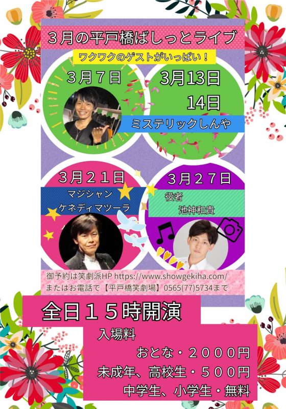 平戸橋ばしっとライブを3月7日(日)、13日(土)、14日(日)、21日(日)、27日(土)の午後3時に平戸橋笑劇場で開催します。