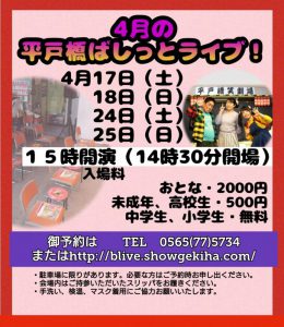 平戸橋ばしっとライブ3周年公演を4月3日(土)午後4時、4日(日)午後3時に平戸橋笑劇場で開催します。