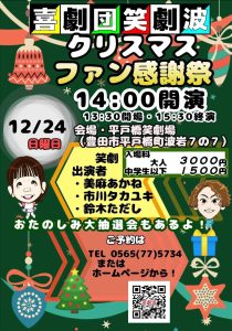 クリスマスファン感謝祭のご予約はこちら Tweet Pocket Share on Tumblr 笑劇波ブログ笑劇波の劇団員が投稿するブログ。劇団員が出張公演で出会った方々、日々の出来事をなどを投稿いたします。皆様からのコメントもお待ちしています。笑劇波ブログ